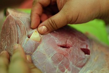 1Духовку сначала обязательно нагревают до температуры 180 градусов – это обязательное условие. Согласно правилам приготовления баранины, мясо необходимо положить на смазанный растительным маслом противень, предварительно разогретый, а потом помещать его в уже горячий духовой шкаф. Пока, согласно рецепту запекания в духовке баранины, первая разогревается, подготавливаем мясо. Берем острый нож, в мякоти делаем им надрезы глубиной до трех сантиметров и в каждый из них вставляем зубчик чеснока, укроп или розмарин. Также баранину можно нашпиговать гвоздикой и лавровым листом.
