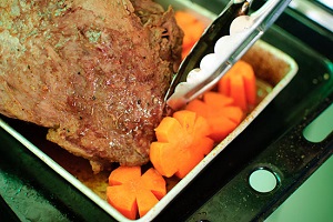 2Сверху мясо натираем крупной солью таким образом, чтобы на его поверхности образовался ее тонкий слой. Эта маленькая хитрость позволит получить тонкую, очень вкусную, аппетитную хрустящую корочку. Нагревшийся противень вынимаем из духовки, раскладываем на нем мясо и отправляем обратно на полчаса. За это время нам нужно приготовить овощи для гарнира. Почищенную морковь режем на тонкие кружки, а картофель - на крупные куски. Из духовки достаем противень с бараниной, еще раз смазываем его маслом и раскладываем вокруг мяса порезанные овощи и опять ставим в духовой шкаф на тридцать минут. Когда это время пройдет, овощи и мясо снова достают, сбрызгивают маслом и еще на полчаса отправляем в духовку.