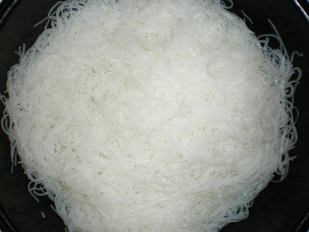 1Кладем фунчоз в миску и заливаем холодной водой на 10 минут. Потом эту воду сливаем и добавляем кипяток. В нем лапша должна полежать пять минут, после чего воду выливаем, а фунчозу, помещенную в дуршлаг, промываем под проточной водой и оставляем на некоторое время, чтобы стекла жидкость.