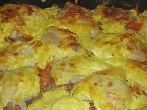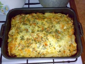 2Противень слегка смазывают растительным маслом и выкладывают на дно картофель. Сверху помещают смешанные с луком грибы, а потом все заливают сливками, в которые предварительно кладут травы, паприку, соль, перец, молотый мускатный орех и имбирь. Сливки можно заменить сметаной, смешанной с молоком. Ставим противень в духовку минут на тридцать.